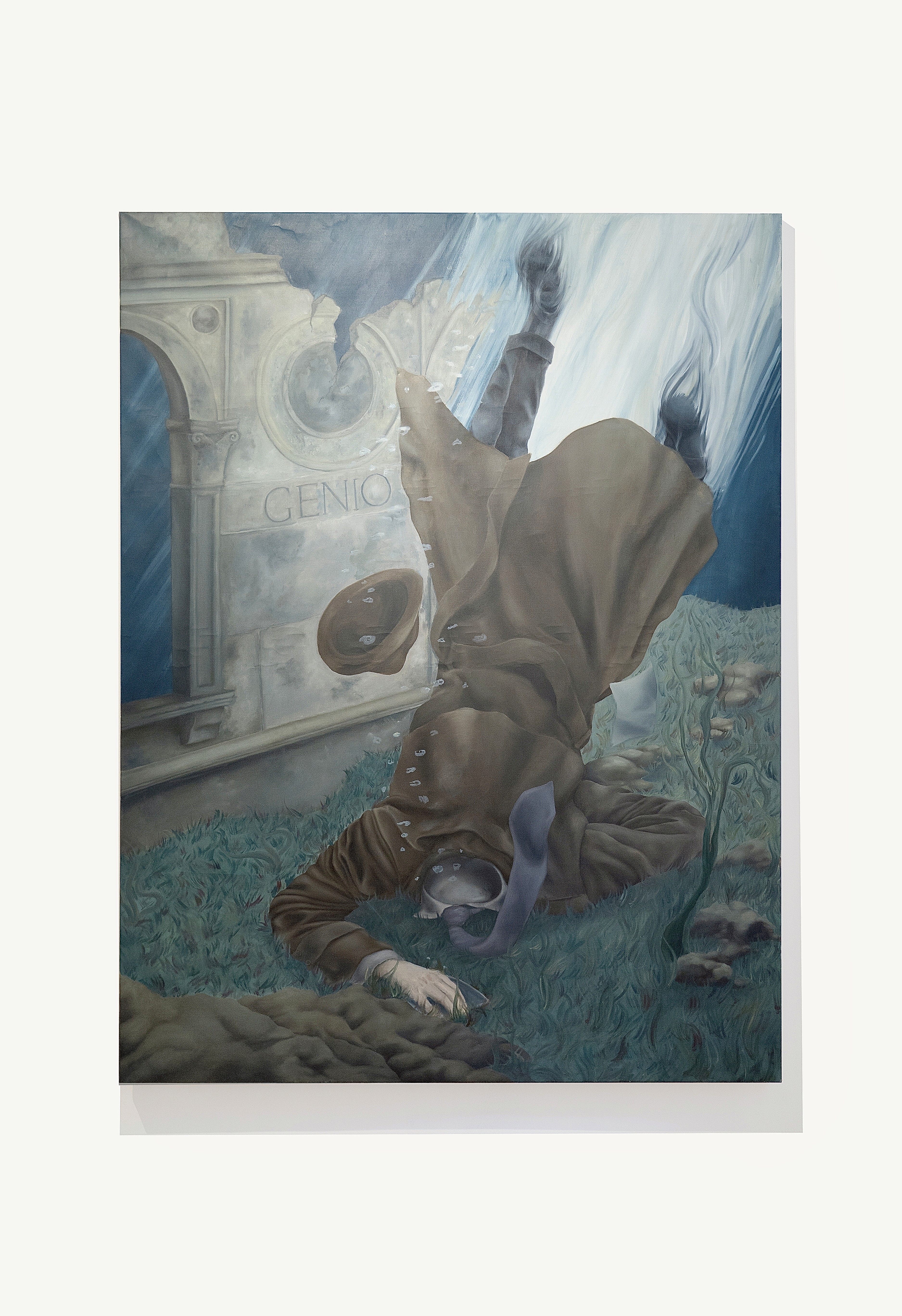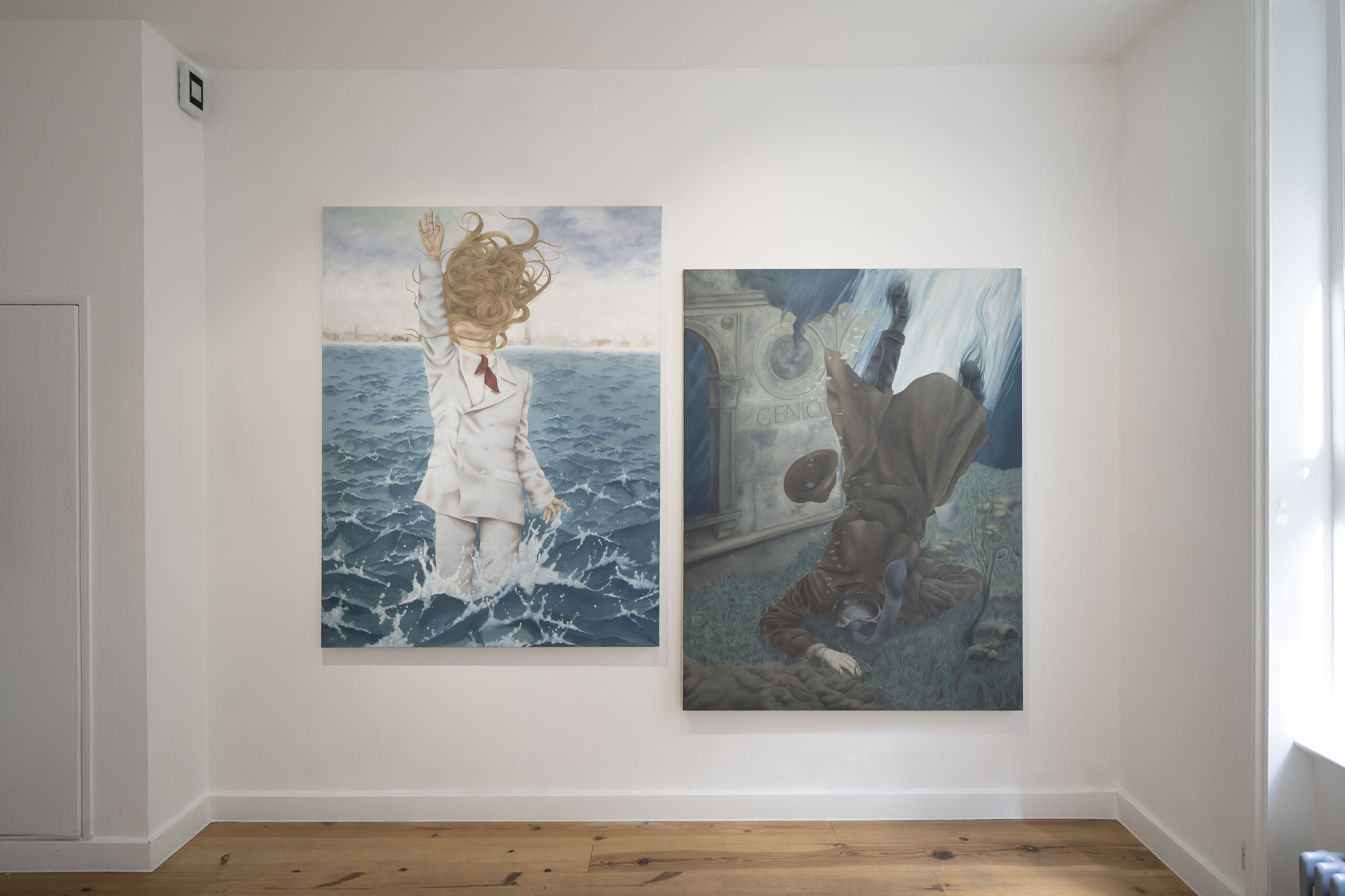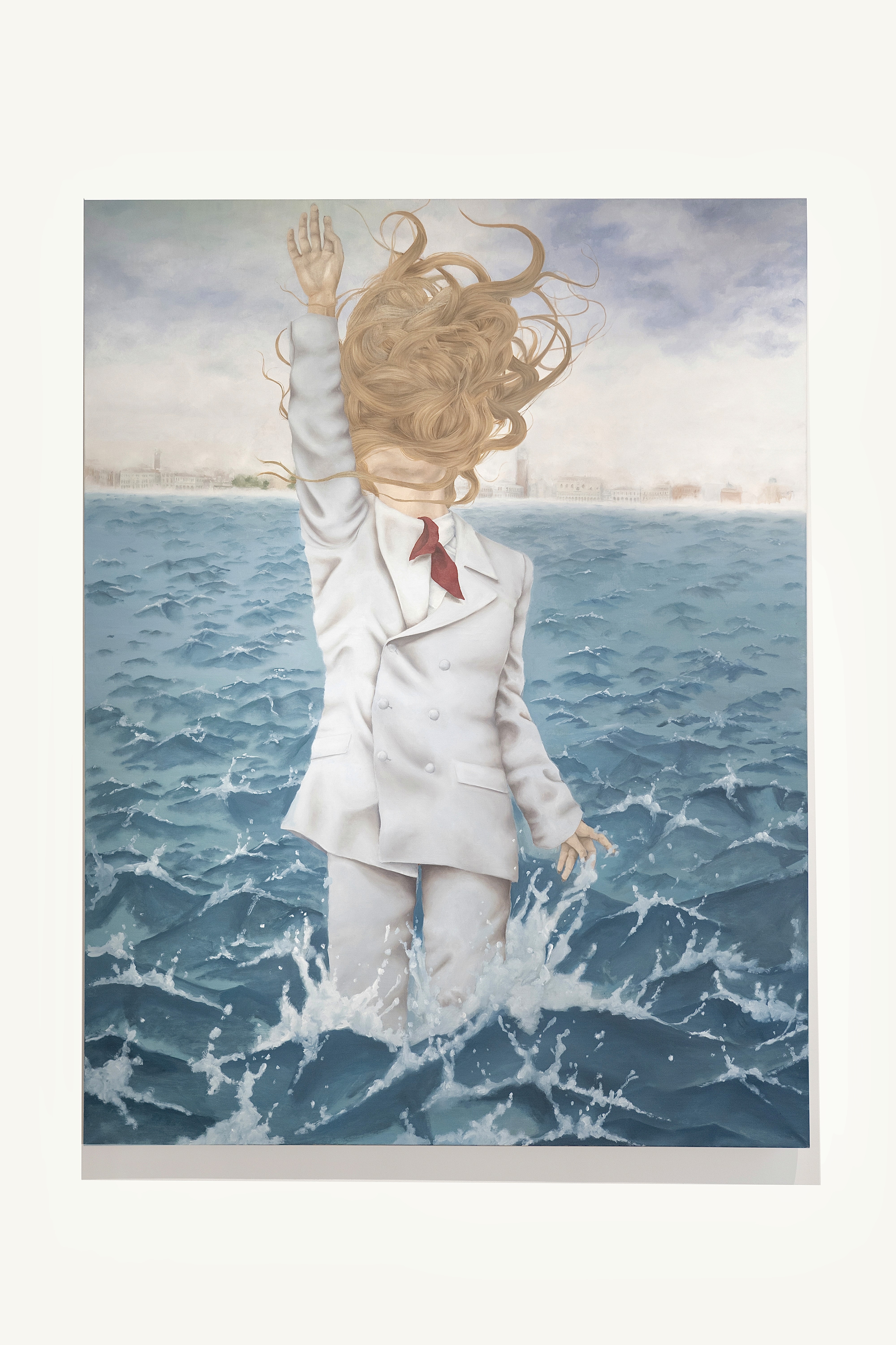 Ivana Vozelj’s diptych introduces visual cues that collapse multiple temporalities—drawing on the myth of Icarus, misty Venetian landscapes, and the iconic imagery of Elvis’s 1968 Comeback Special jacket. Her visual language is grounded in the contemporary, yet it deliberately mimics the aesthetic codes of analogue photography—light leaks, faded colours, cinematic framing—to evoke a sense of belatedness and spectral familiarity. These vintage photographic effects are not stylistic flourishes, but conceptual tools: they signal the distance between past and present while simultaneously collapsing them. In doing so, Ivana transforms the canvas into a heterotopic space where history circulates not linearly, but recursively—filtered, distorted, and re-performed through the logic of image culture. Nostalgia, here, is neither sentimental nor passive, but a critical mode of engaging with how memory is constructed and consumed in late capitalist visual regimes.