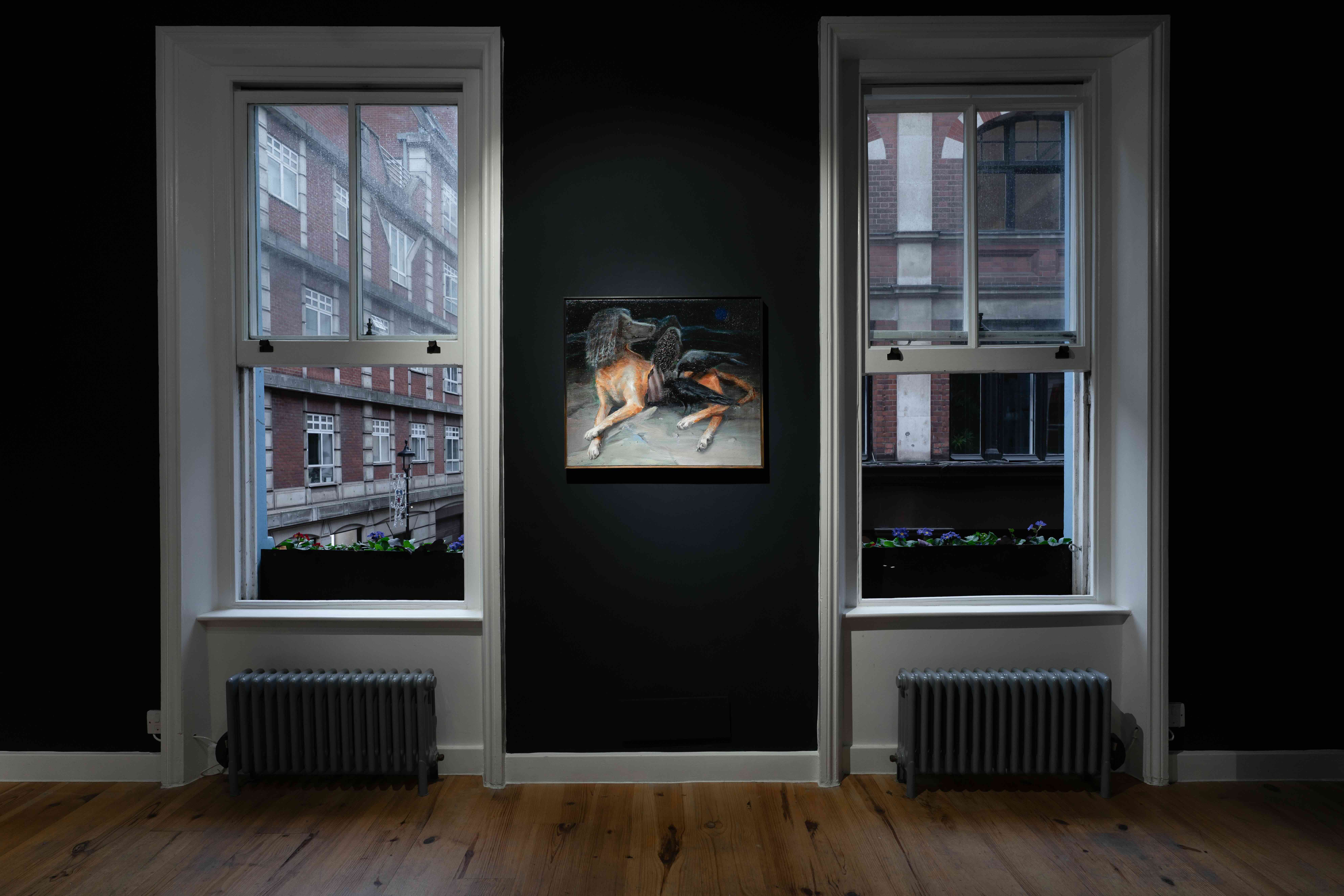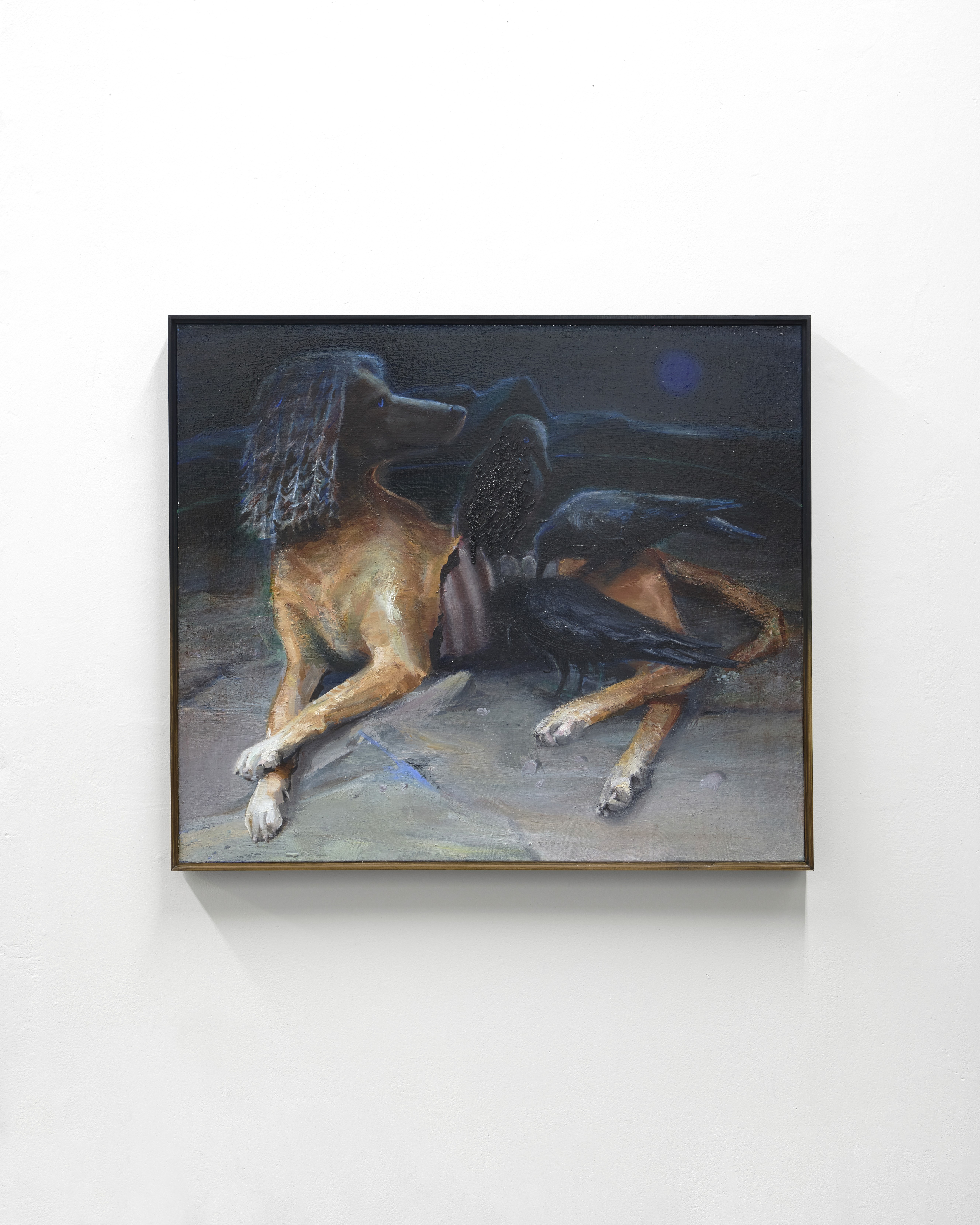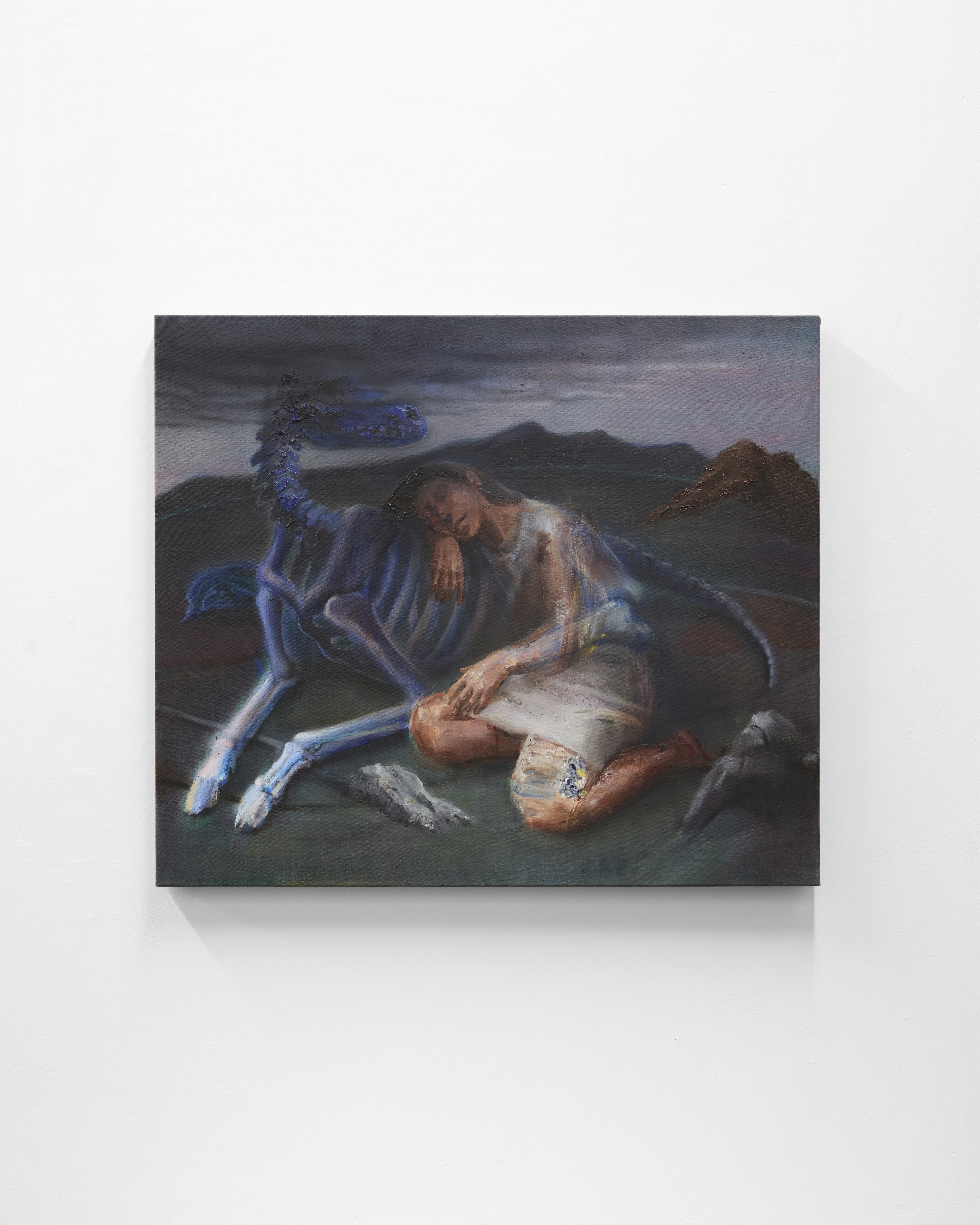 This exploration of hybrid states extends to her other two paintings, Between the Dawns I and Between the Dawns III (2025). Both stage encounters between bodies that don’t entirely cohere. In Between the Dawns I, a dog lies composed but not quite relaxed at night, its torso interrupted by three black birds – a seam where feathers and fur overlap without resolving into a single, stable image. Between the Dawns III follows this logic of shared edges: a figure leans into the cool, luminous skeleton of an animal, their body softening into the gaps between its ribs and limbs. Across both works, the emphasis is on the space where bodies meet, offering moments of contact suspended just long enough to be seen before they slip back into ambiguity. The creatures embody what the artist describes as a ‘double feeling’ – existing in a paradoxical state between life and death, fear and embrace. These smaller paintings function as parallel emanations rather than sequential scenes, operating as afterimages that cling to reality's residue while invoking its absence.