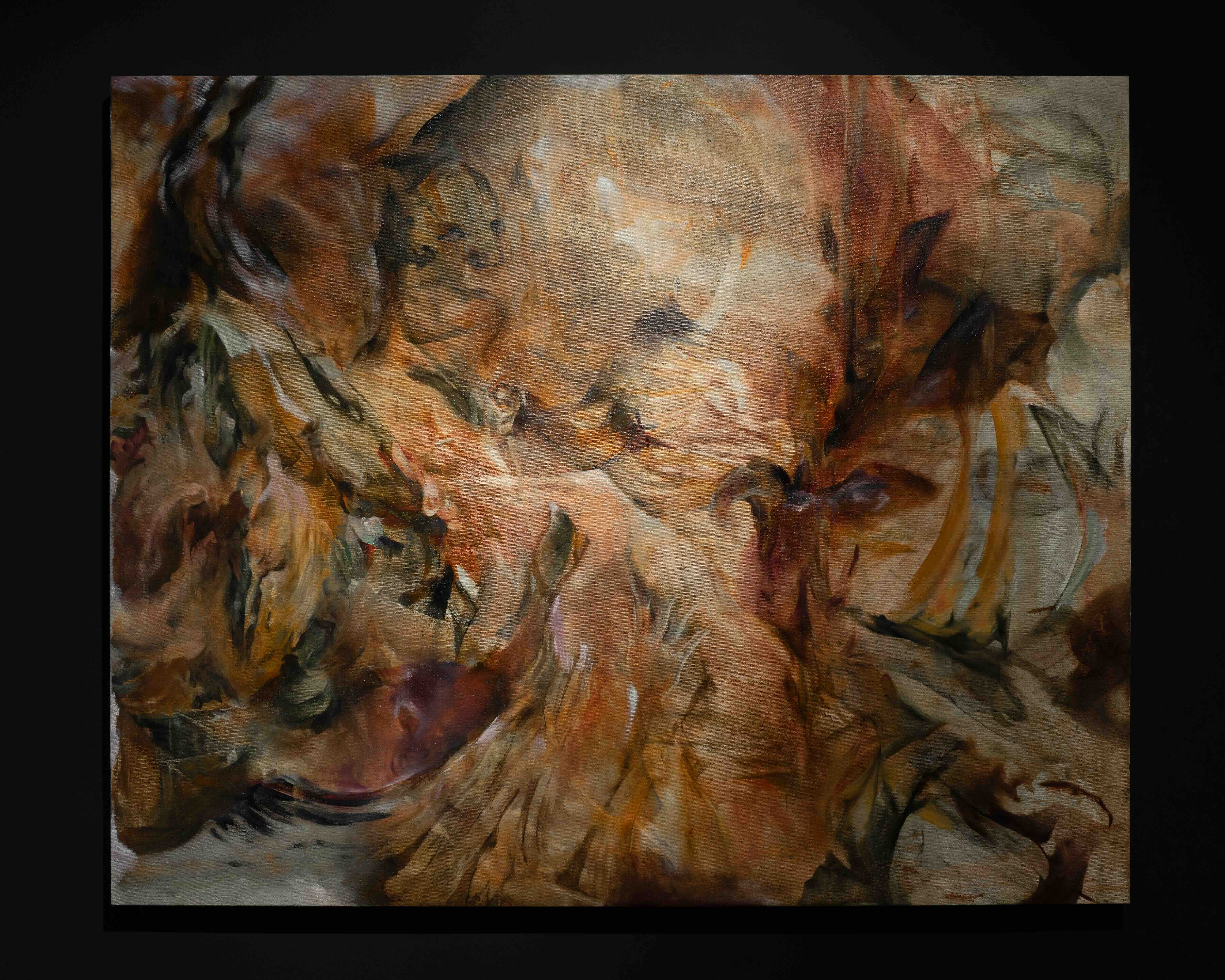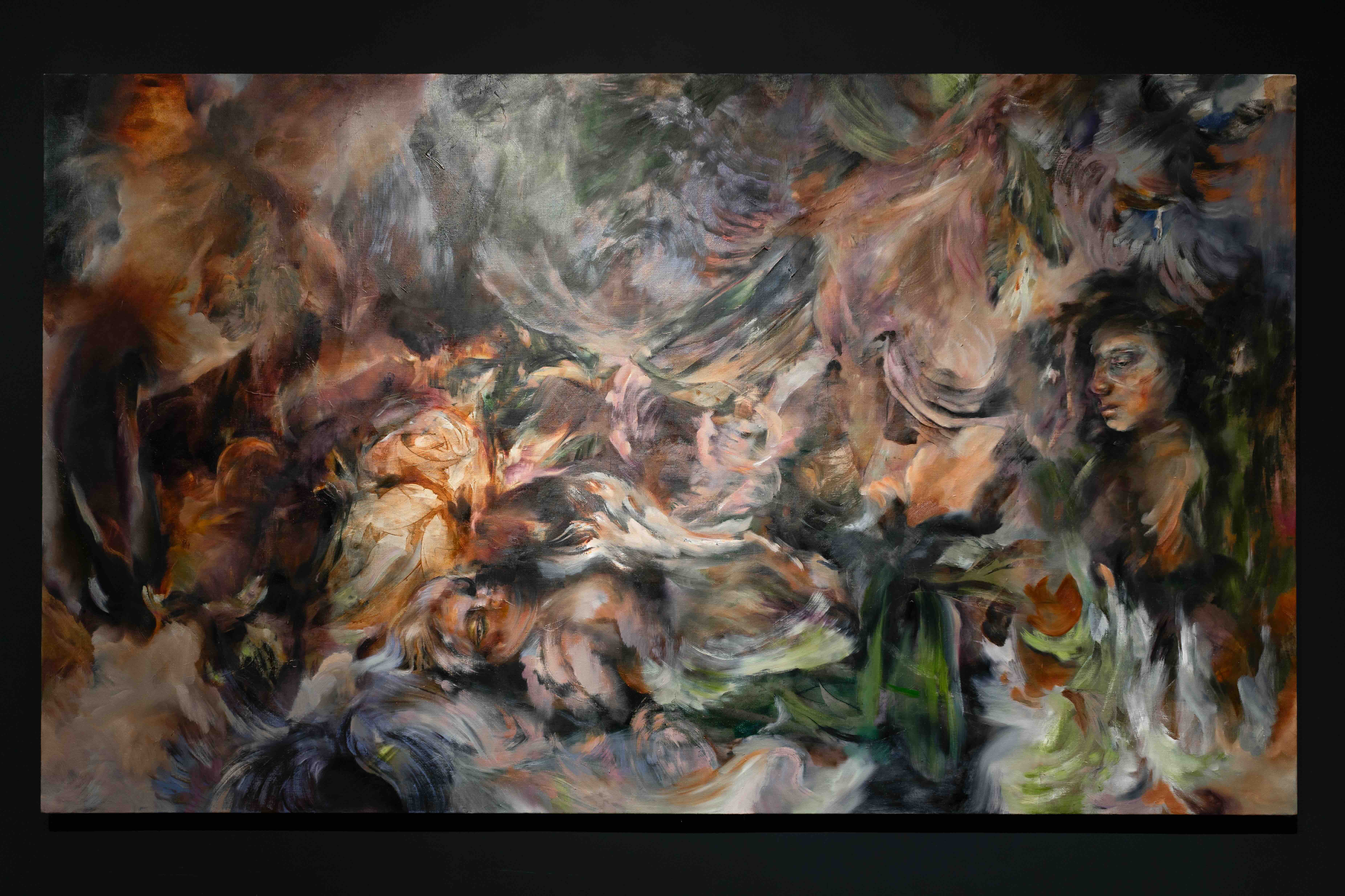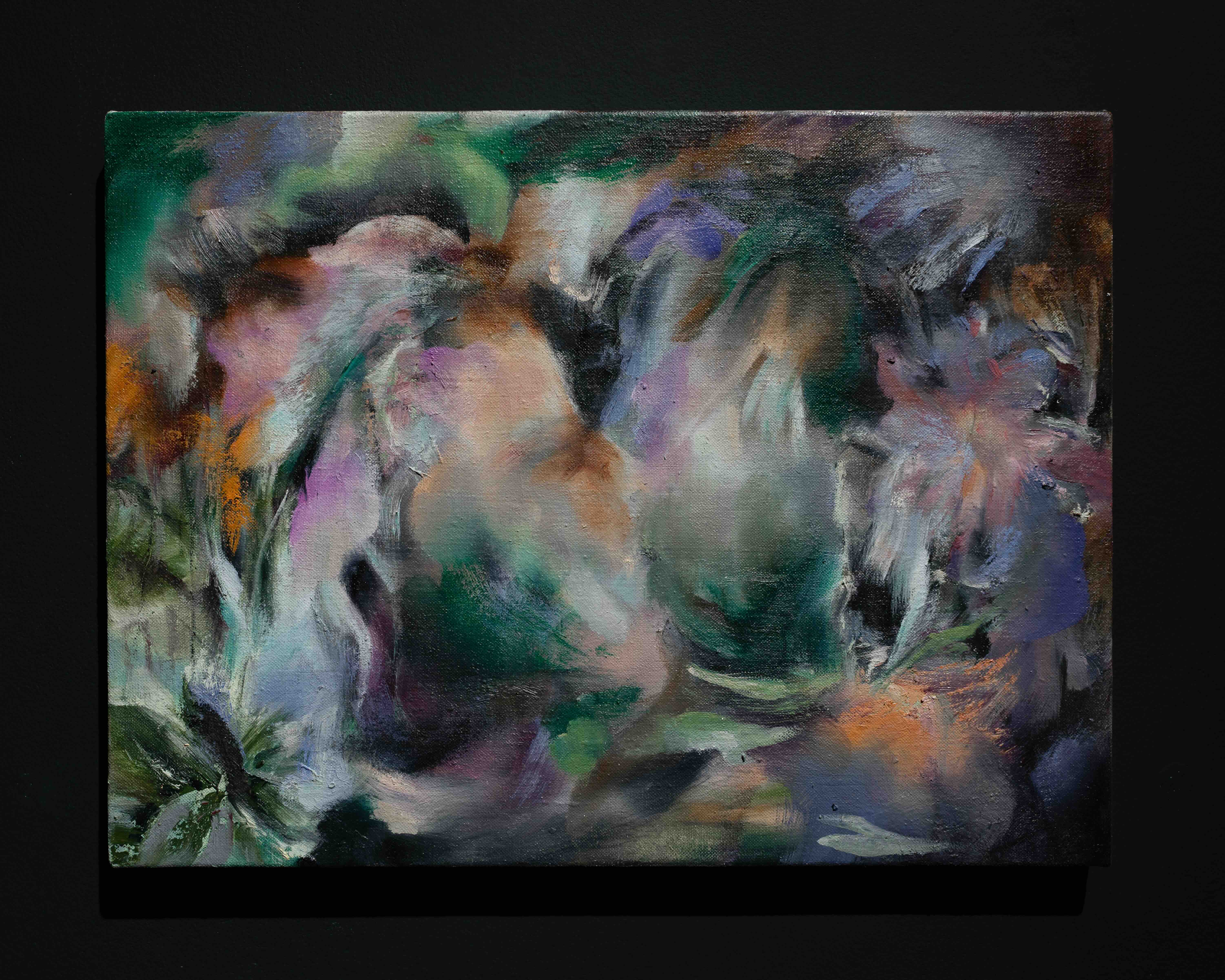 This approach finds its full, immersive expression in her large-scale paintings, One Thousand Sunday Suns and The Winged World (2025). These works inhabit a terrain of perpetual metamorphosis, where bodies, landscapes and atmospheres bleed into one another without settling into fixed form. In One Thousand Sunday Suns, warm earth tones churn into vegetal, smoky textures, producing a vortex of gestures in which faces, limbs and organic matter flicker in and out of recognition. The Winged World extends this logic into a more tempestuous register, its bruised greens and purples gathering into a storm of wings, clouds and half-submerged figures. In both, the paint behaves like a living substance – muscular, volatile and porous – creating scenes that feel weathered into existence. In contrast, a smaller painting like Hidden Hold (2025) compresses this atmospheric turbulence into an intimate, almost inhaled scale. Here, the image feels like the interior of a gesture – a pocket of movement briefly stilled. Soft violets, greens and smoky blues mingle with flashes of peach and ochre, creating a chromatic mist that refuses to settle into recognisable forms. The brushstrokes appear to brace around a secret centre, containing a latent energy that is never released – a vessel of suspended potential.