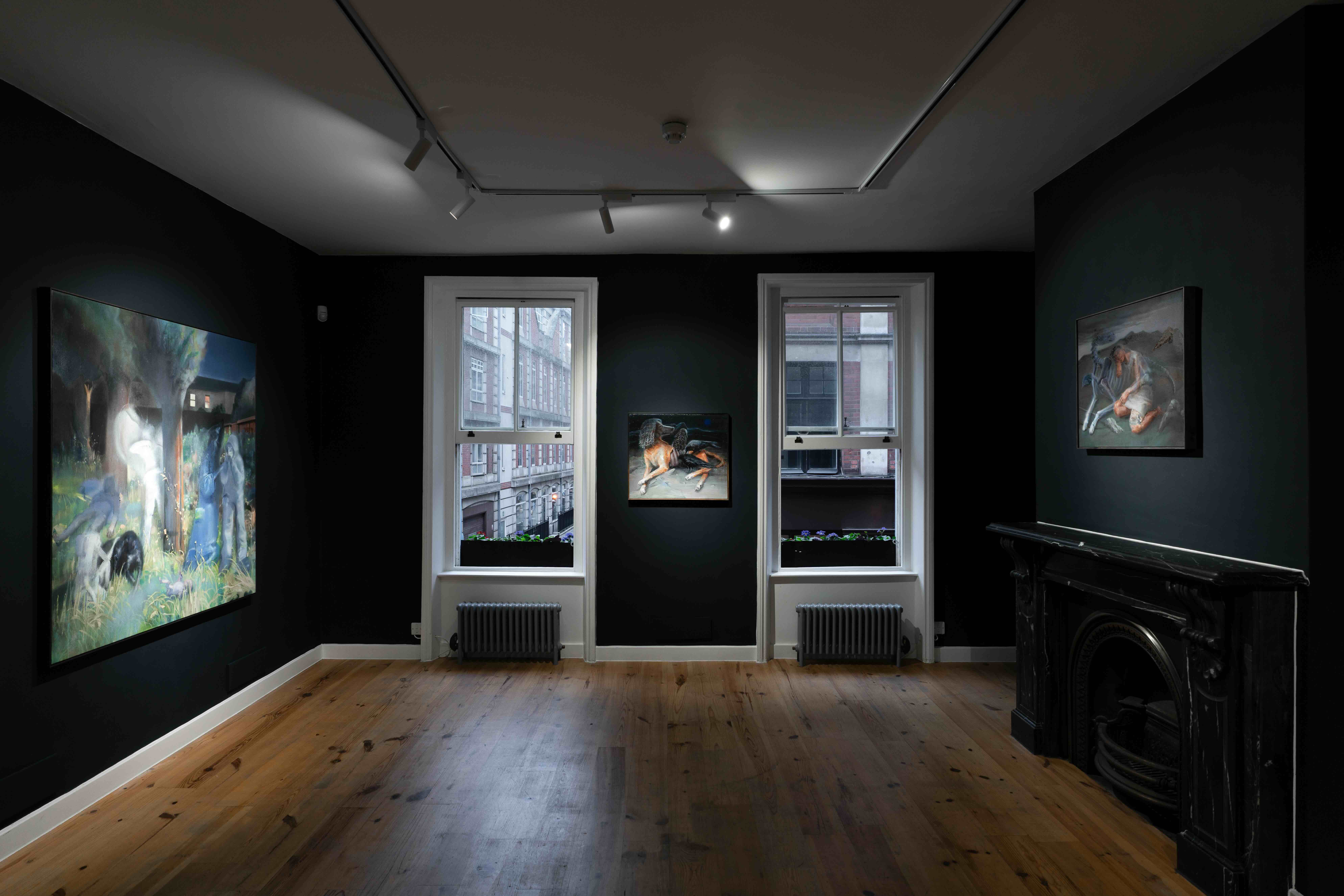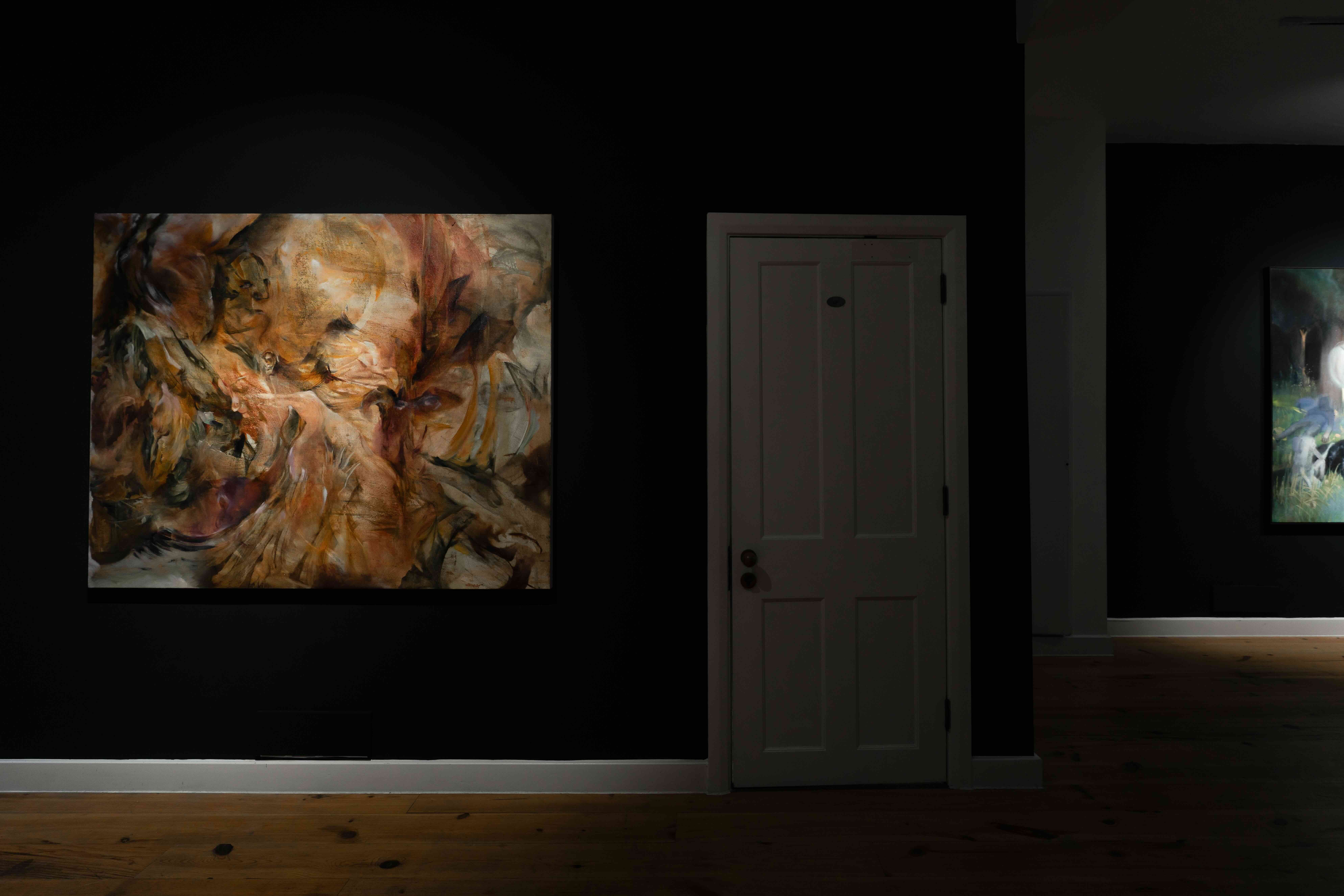 Spectral Message brings together the paintings of Soryun Ahn and Lulu Stephenson in a dialogue centred on deferred narrative – a meaning that is constantly arriving, never fully grasped. Within a gallery painted dark navy, their works appear as scattered apparitions. Both artists approach painting as a time-based medium investigating the boundary between real and imagined worlds, yet through divergent methods. Ahn constructs carefully staged, figurative, theatrical imagery where mundane and mythological elements collide, while Stephenson pursues the physical traces of movement through her tools, excavating forms from the material itself to produce more abstract scenes. Their works share a language of light and illegibility, where stories suggest themselves but resist closure.