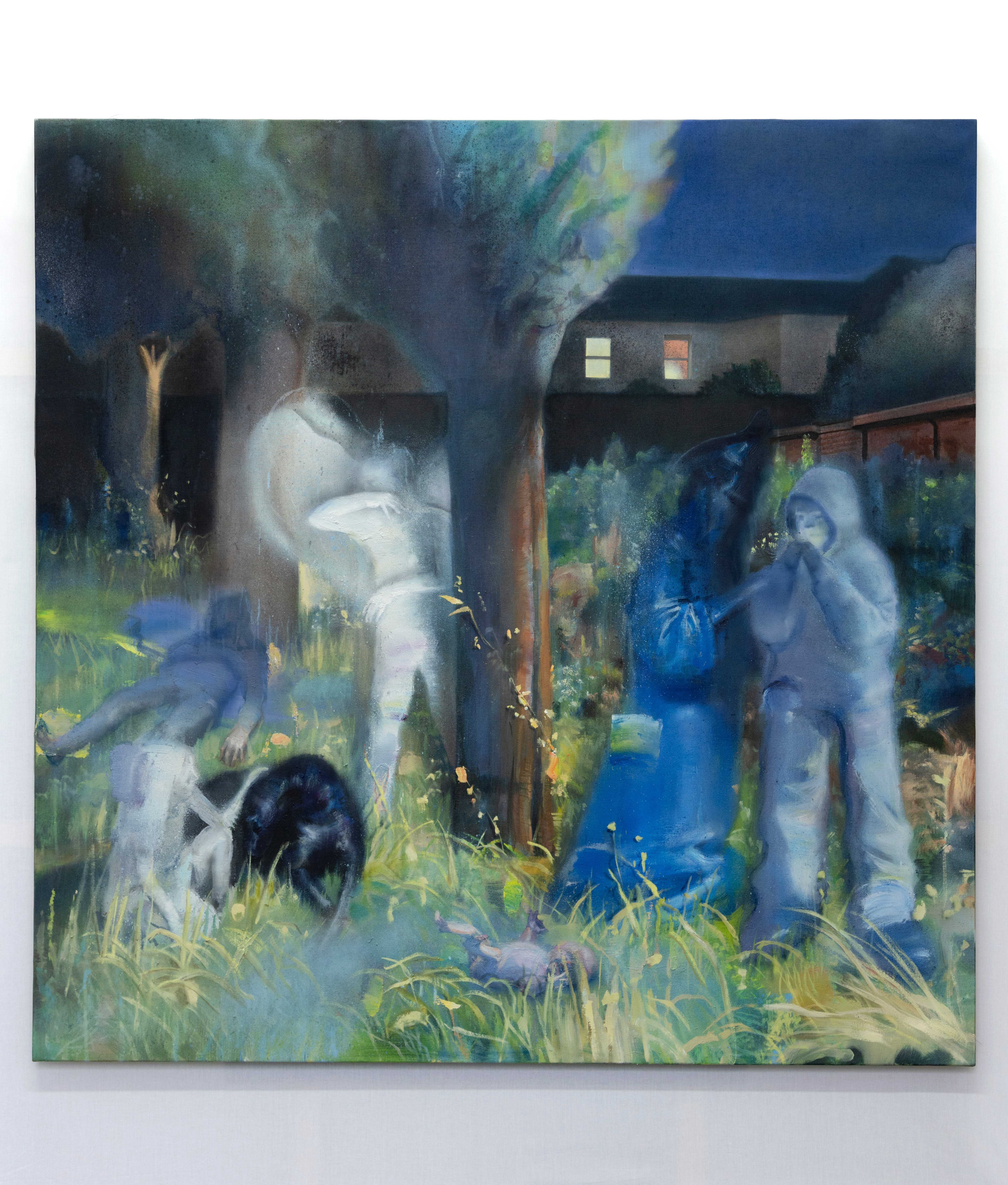 Soryun Ahn’s paintings depict psychologically charged mythic scenes caught between familiarity and mystery, capturing moments that suggest significance while withholding explanation. Their theatrical quality results from a methodical process where Ahn photographs, prints and redraws each evolutionary stage before applying paint to canvas. In works like Nocturnal Apparition (2025), an ordinary British streetscape appears under artificial blue light, as if illuminated by a camera flash. Within this manufactured glow, indistinct figures materialise: a tracksuited figure, a winged entity, a child caressing an animal, a baby lying in the grass. The presences occupy the same space without clear narrative connection, and their averted gazes enhance the sense that the viewer is glimpsing isolated beings suspended across multiple mythologies or dimensions.